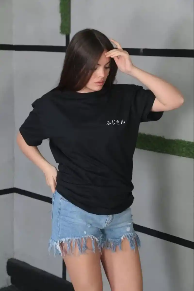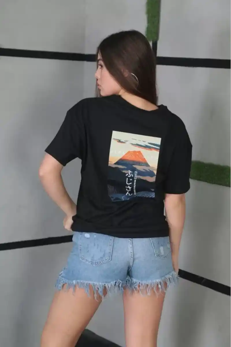 Unisex Bisiklet Yaka Baskılı Oversize T-Shirt - Siyah