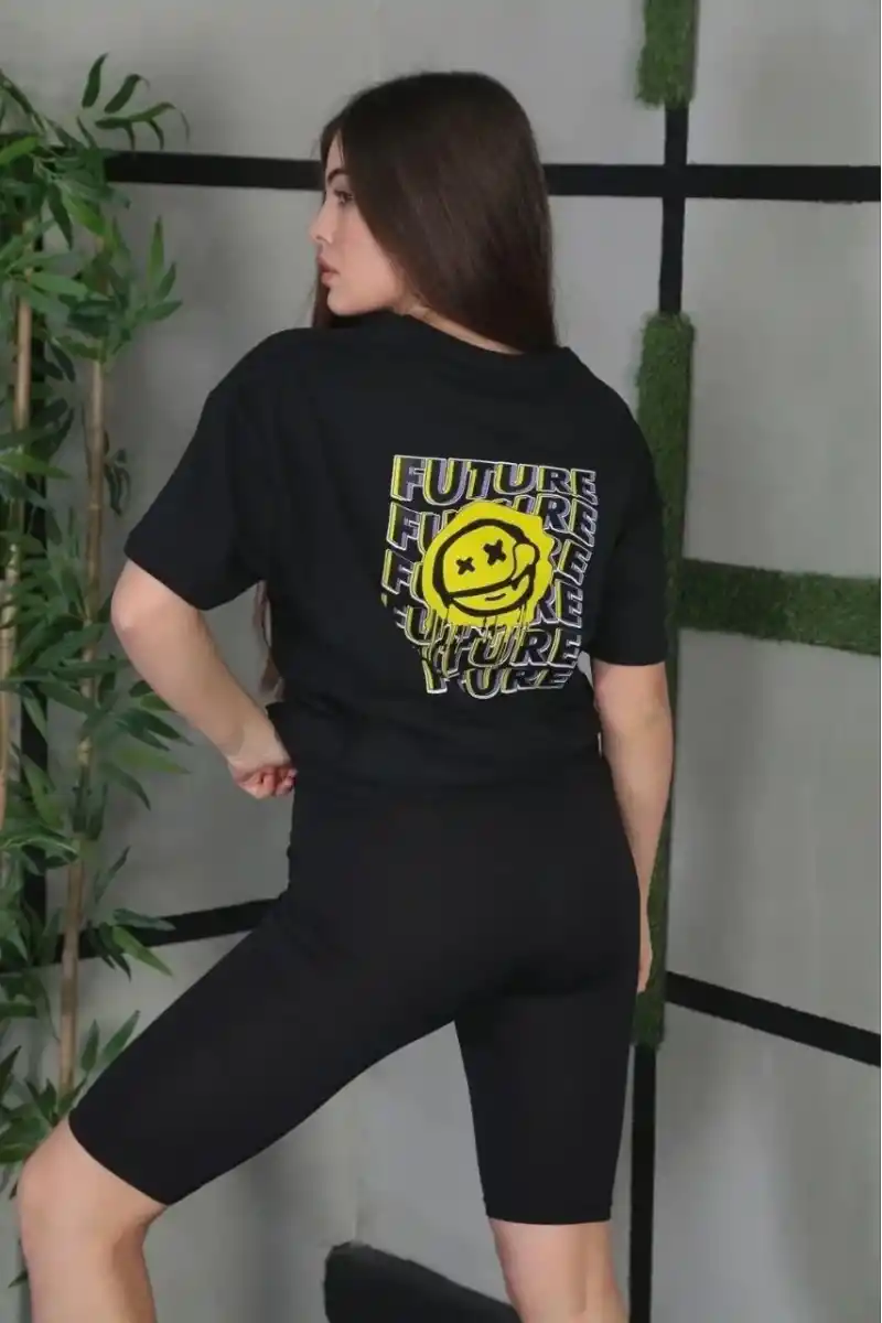 Kadın Bisiklet Yaka Baskılı Oversize T-Shirt - Siyah
