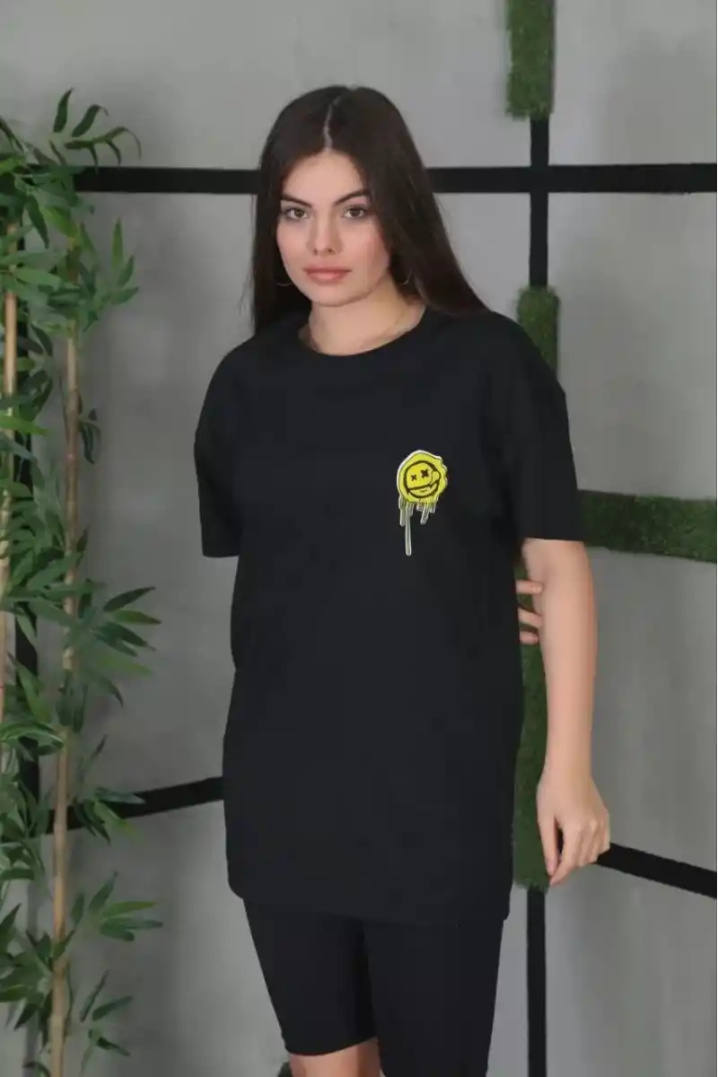 Unisex Bisiklet Yaka Baskılı Oversize T-Shirt - Siyah