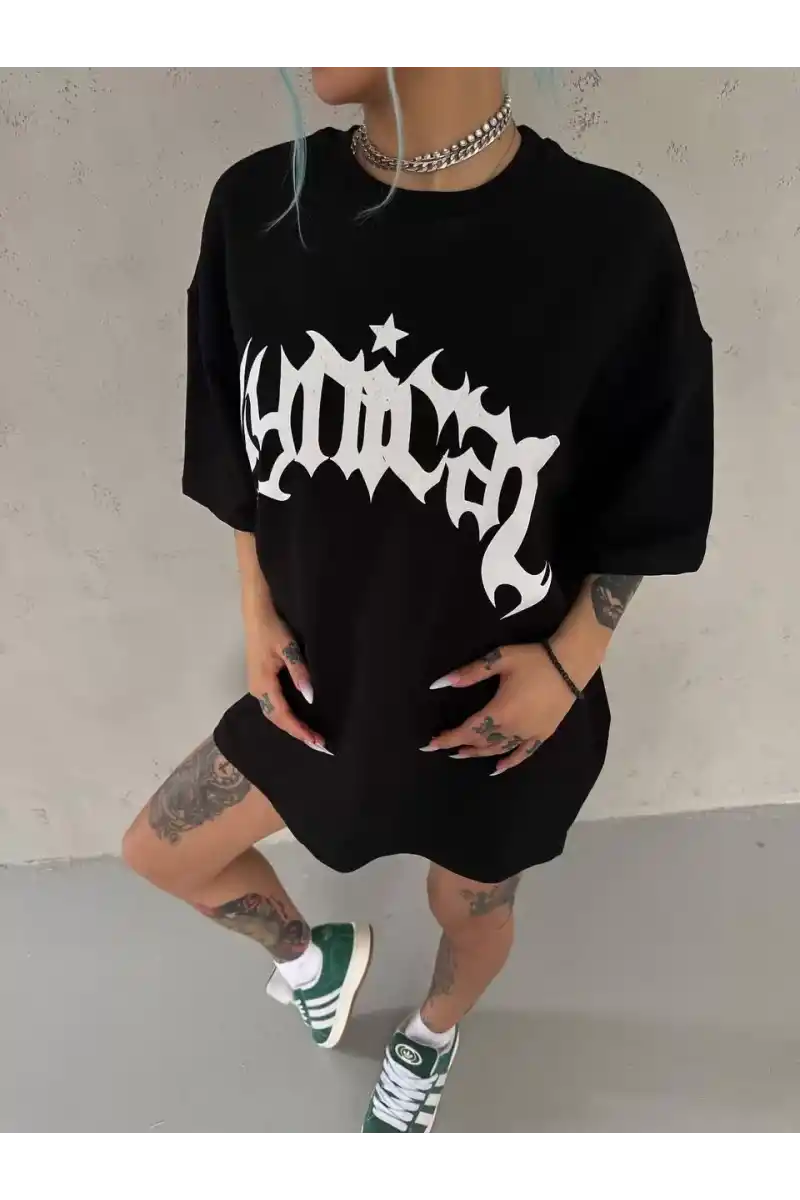 Unisex Bisiklet Yaka Baskılı Oversize T-Shirt - Siyah