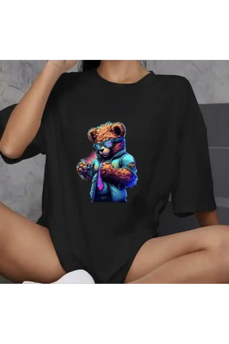 kadın Bisiklet Yaka Baskılı Oversize T-Shirt - Siyah