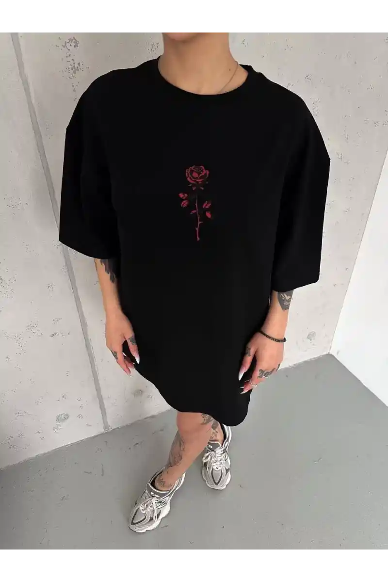 Unisex Bisiklet Yaka Baskılı Oversize T-Shirt - Siyah