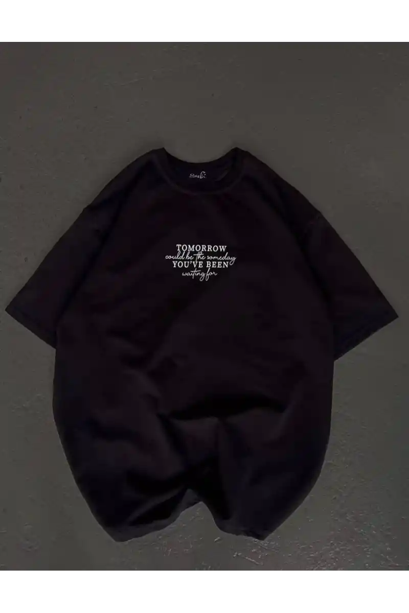 kadın Bisiklet Yaka Baskılı Oversize T-Shirt - Siyah