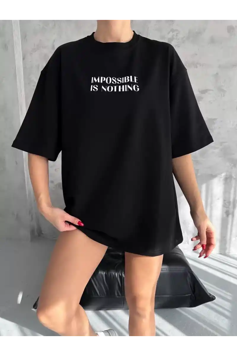 Unisex Bisiklet Yaka Baskılı Oversize T-Shirt - Siyah