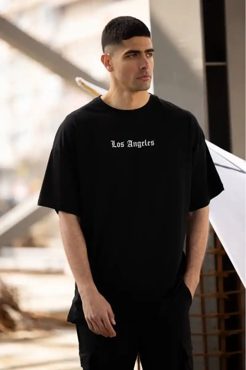 Unisex Bisiklet Yaka Baskılı Oversize T-Shirt - Siyah