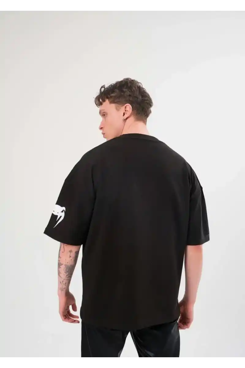 Unisex Bisiklet Yaka Baskılı Oversize T-Shirt - Siyah