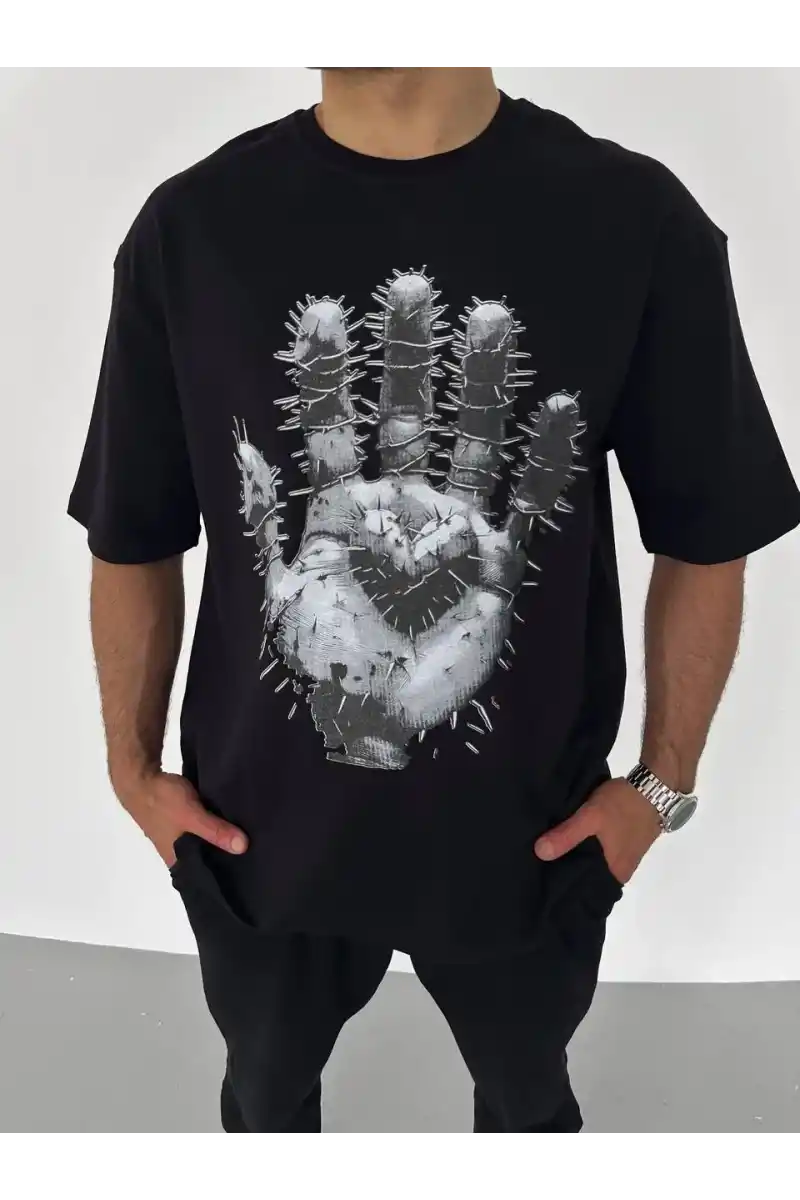 Unisex Bisiklet Yaka Baskılı Oversize T-Shirt - Siyah