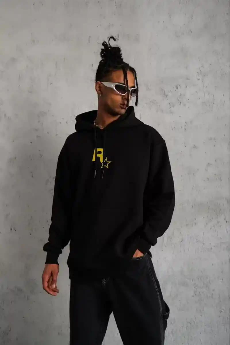 Unisex Kapşonlu Baskılı Sweetshirt - Siyah