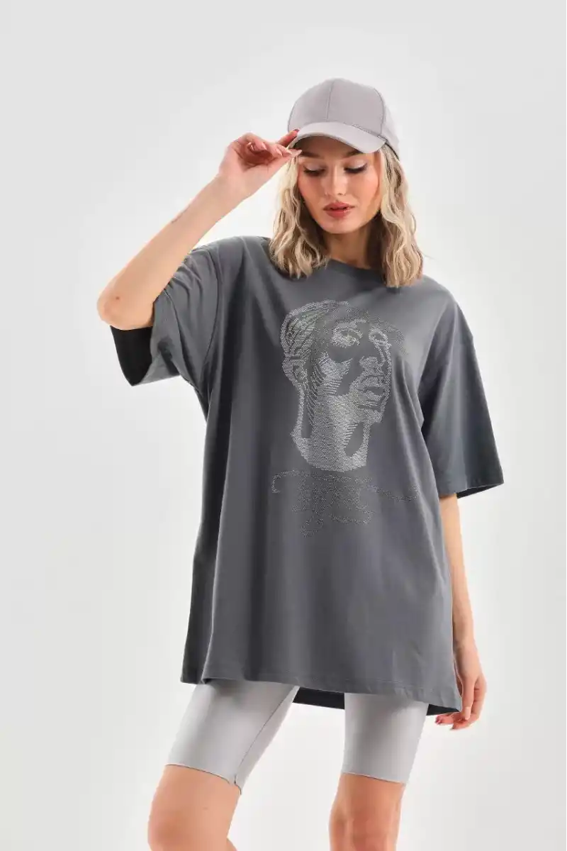 Unisex Taş Desenli Oversize T-Shirt - Füme