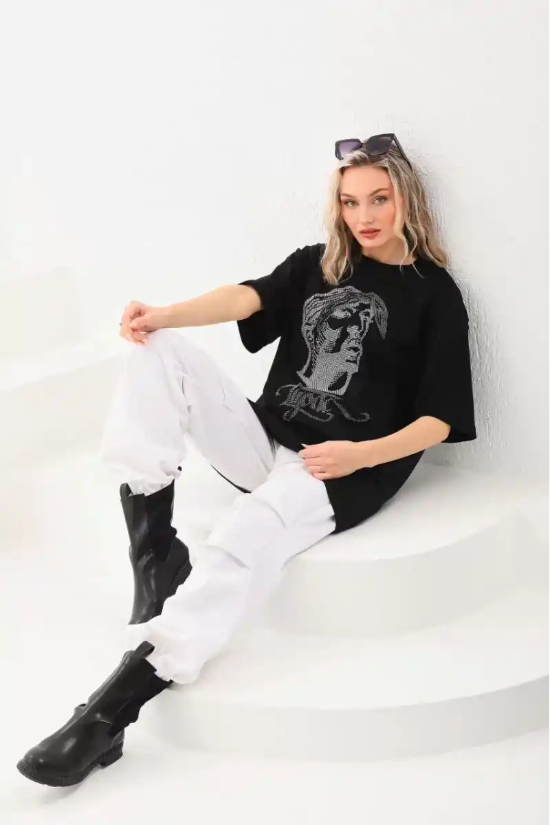 Unisex Taş Desenli Oversize T-Shirt - Siyah