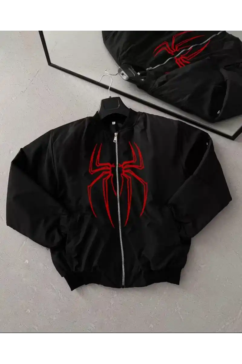 Örümcek Desenli Siyah Bomber Mont – Unisex Kullanıma Uygun, Fermuarlı Cepli, Kapitone Astarlı, Bahar Kış Günlük Giyim İçin Moda Ceket Modeli - Siyah