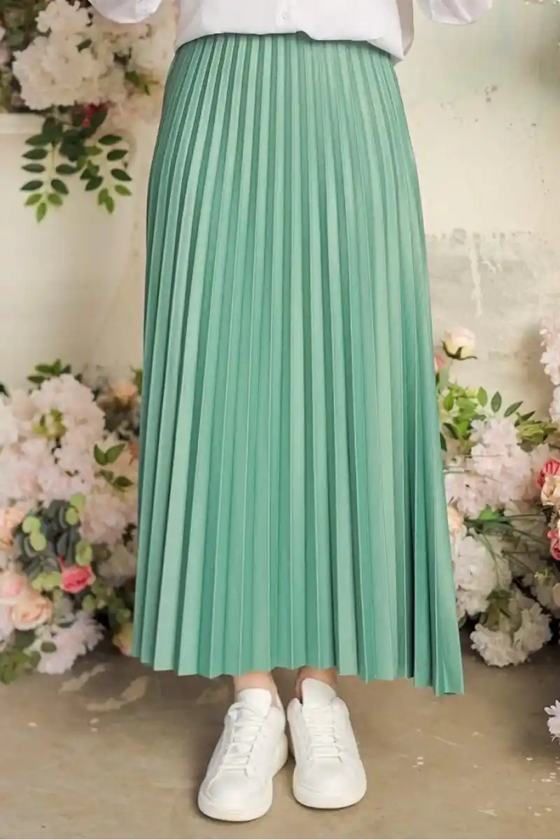 -Pileli detaylar, eteğe hareket ve hacim katarken aynı zamanda feminen bir dokunuş sağlar. Bu detaylar, eteğin tarzını ve çekiciliğini artırır, böylece her kombinde dikkat çekici bir seçenek haline gelir. Mint rengi, ferahlık ve enerjiyi simgelerken, aynı zamanda modern bir tarzı da yansıtır.